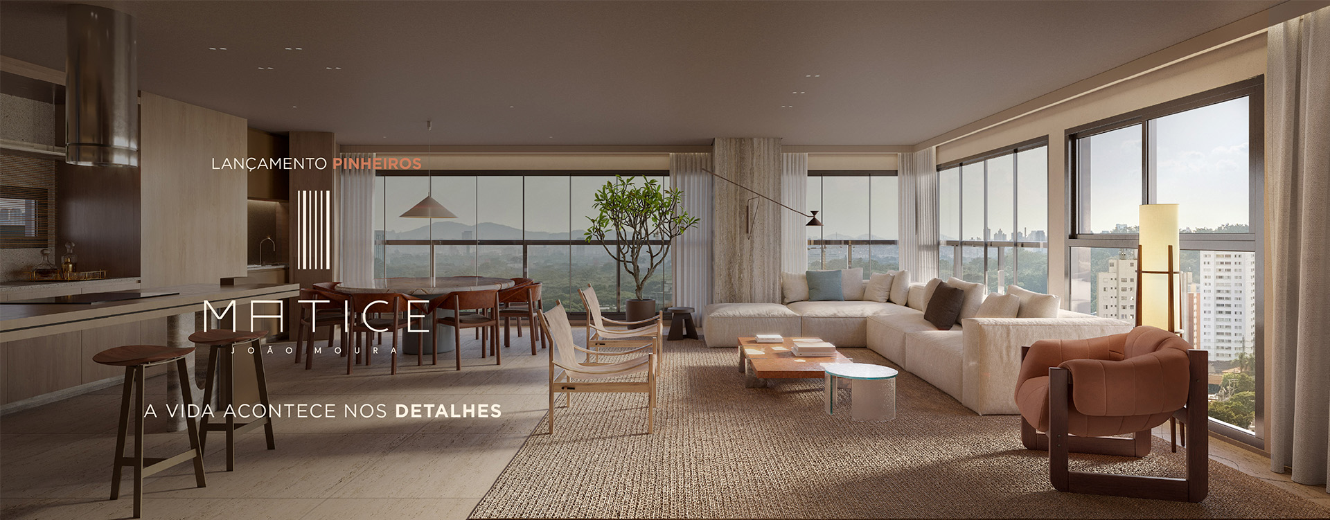 O living com pé-direito alto e janelas amplas trazem a calmaria da natureza e o dinamismo do cenário urbano para dentro. É uma experiência de viver a cidade em sua essência.